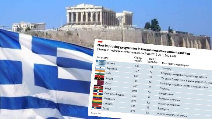 H Ελλάδα καταγράφει τη μεγαλύτερη βελτίωση στο επιχειρηματικό περιβάλλον μεταξύ 82 χωρών σε παγκόσμιο επίπεδο, σύμφωνα με τον δείκτη business environment index της Μονάδας Μελετών και Ανάλυσης (Economist Intelligence Unit – EIU) για την περίοδο 2024-28.