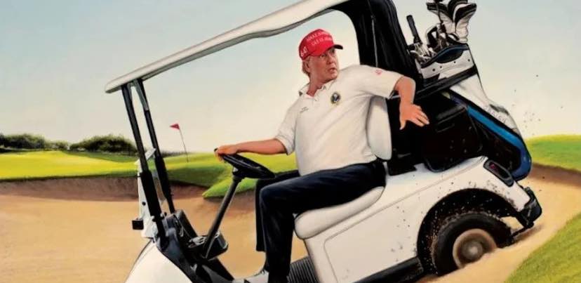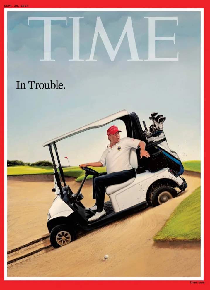 Τις εκτιμήσεις έρχεται να επιβεβαιώσει και το εξώφυλλο του «Time», που δείχνει τον Ντόναλντ Τραμπ σε ένα γκολφ καρτ, εγκλωβισμένο σε μια ανηφόρα, και τη φράση «Σε μπελάδες».